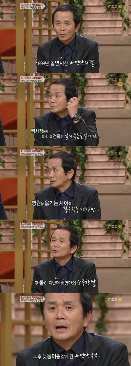 배영만은 "정말 못 보겠더라. 그 후 늦둥이를 갖게 됐는데 더 미안하고 생각이 났다. 자식은 가슴에 묻는다고 하지 않느냐. 차라리 내가 아팠으면 했다. 딸이 호흡이 곤란해 죽었는데 얼마나 숨이 막혔을까 생각하면…. '내가 죄를 많이 지어서 그런가'하는 생각이 든다"며 눈물을 흘려 안타까움을 자아냈다. <스포츠조선닷컴>