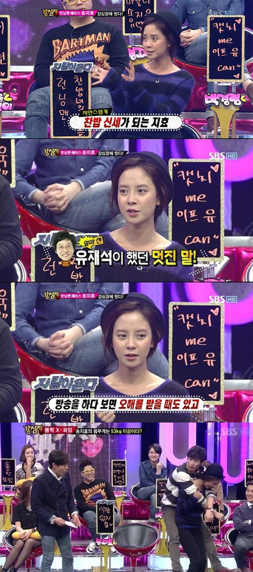 한편 이날 방송에서 송지효는 '몸무게가 53kg 이상이다'라는 소문의 의혹을 풀기 위해 패널 은혁에게 직접 업혀 몸무게 검증에 나섰으나, 오히려 자신의 몸무게가 59kg이라고 밝힌 은혁을 거뜬하게 업어 놀라움을 줬다. <스포츠조선닷컴>