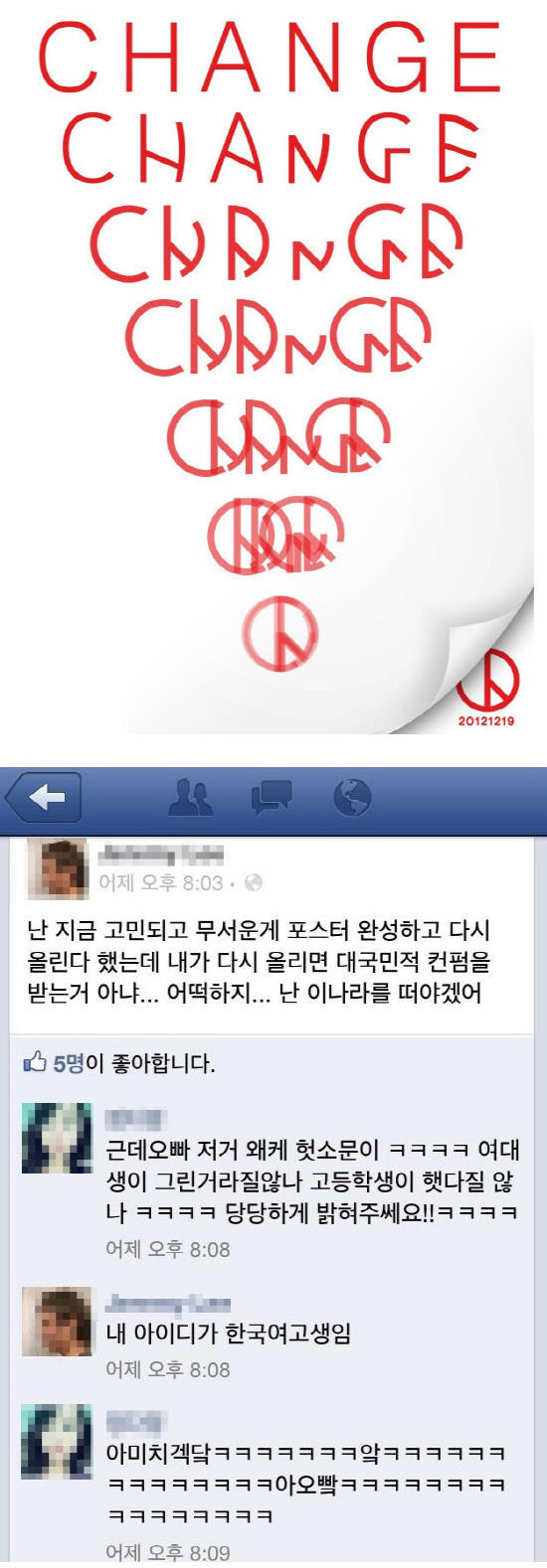 한편 '한국여고생'이란 아이디를 사용하는 네티즌은 자신의 페이스북에서 지인들에게 "아이디가 '한국여고생'이라서 여고생이 만든 포스터라고 알려지는 것 같다"며 "다시 작품을 올리면 대국민적 확인을 받아야 하나"라는 걱정을 하고 있어 네티즌들을 폭소케 했다. <스포츠조선닷컴>