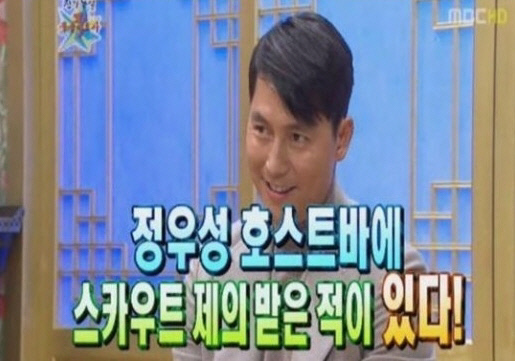 또 장동건-고소영 부부의 결혼식에서 부토니아를 받은 사연에 대해서는 "장동건 고소영 결혼식만 아니면 엎었을 것 같다. 바라지도 않았는데 김승우가 부케받는 식순에서 '정우성, 정우성' 이랬다. 그러자 모두 내 이름을 외쳤다. 웃음도 감동도 없었다. '나 지금 뭐하는거지?'라고 생각했다. 받자마자 내려오면서 모르는 여자분께 줬다"고 설명했다.