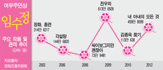 공부에도 관심 없고, 고교 시절 본 연극 '리어왕'에 감명받아 연기를 시작했다던 임수정이 빛을 발하기 순간은 청룡과의 만남 이후부터다. 2003년 23세의 나이에도 동안 미모를 뽐내며 영화 '장화, 홍련'에서 여고생 수미 역을 따냈다. 수미는 계모(염정아) 밑에서 망상에 시달리는 가운데에도 동생(문근영)까지 챙겨야 하는 여고생. 청아한 목소리와 섬뜩한 표정 연기는 대중의 시선을 사로잡았고, 제24회 청룡영화상에서 신인여우상 트로피를 품에 안았다.
