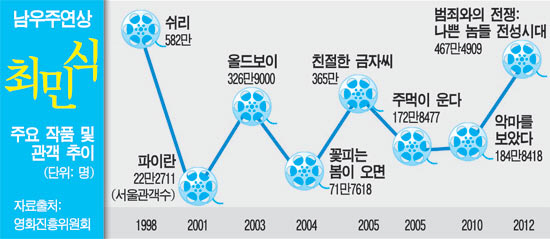배우 최민식이 세번째로 청룡을 거머쥐었다. 이미 '파이란'과 '올드보이'를 통해 2001년과 2003년 남우주연상을 수상한 바 있는 최민식은 올해 '범죄와의 전쟁:나쁜 놈들 전성시대'(이하 범죄와의 전쟁)를 통해 또 다시 진가를 인정받았다. 한국 최고의 배우라는 수식어가 전혀 아깝지 않은 배우라는 사실을 다시 한번 입증한 것이다.