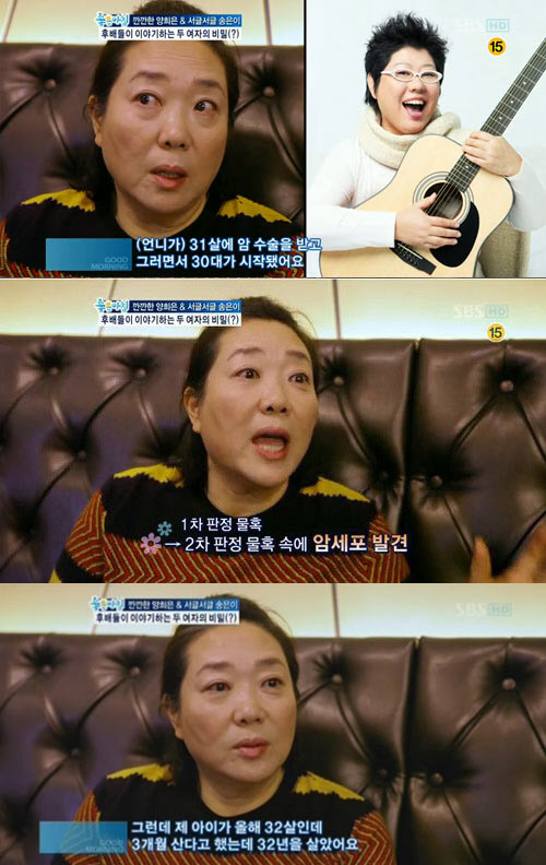 앙희경은 "언니(양희은)가 31살 때 암 수술을 받았다. 암 수술을 받으면서 30대가 시작된 것이다. 언니의 30대는 죽음의 기로, 생사의 기로였다"고 말문을 열었다.