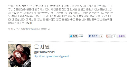 은지원은 6일 자신의 트위터에 "유세현장에 처음 가봤다. 열정이 넘치고 흥분의 도가니였다. 날씨도 추운데 많은 분들이 와주셔서 감사 인사를 전할 겸 인사도 드리고 응원차 다녀왔다. 마치 못할 짓 한 사람처럼 참 심한 말들도 많고 기분이 좀 그렇다"는 글을 게재했다. 이어 "다시 한 번 날도 추운데 와주신 분들께 감사드리고 나라를 위해 애쓰시는 여러 후보님들 정말 고생 많으시다. 존경한다. 나 역시 더 열심히 몸 아끼지 않고 웃음과 좋은 모습 보여 드리도록 열심히 노력해야겠다. 화이팅"이라고 전했다.