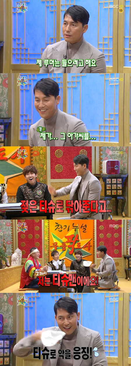 이에 MC들이 "루머가 디테일하다"고 말하자 정우성은 "나는 '티슈맨'이다. '티슈맨'이라는 영화도 찍을 거다. 악을 응징할 때도 티슈를 뽑고, 사랑할 때도 티슈와 함께할 거다"라며 휴지를 뽑아 던지는 흉내를 내 폭소케 했다.
