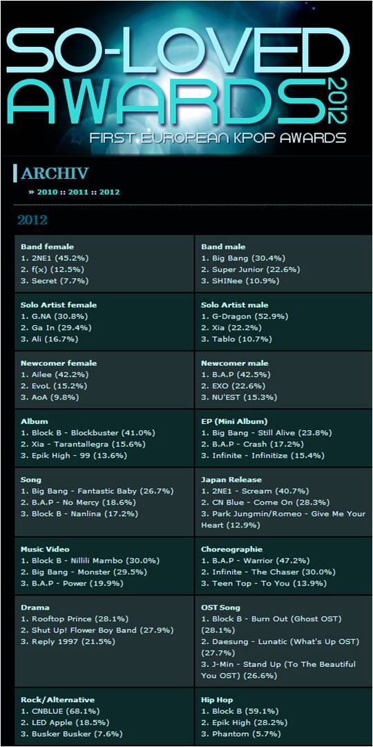 한편 B.A.P는 9일 유럽인 투표로 진행되는 'So-loved Awards 2012'에서 남자신인상과 베스트 안무상을 수상하며 2012년 최고 기대주임을 입증한 바 있다.