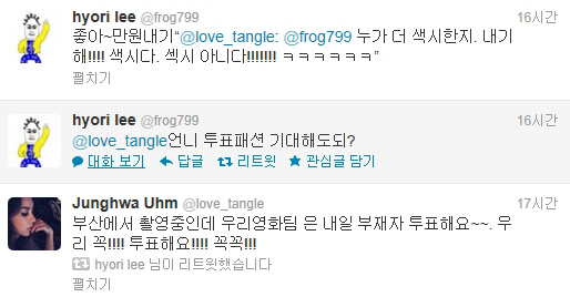 엄정화는 12일 자신의 트위터에 "부산에서 촬영중인데 우리 영화팀은 내일 부재자 투표해요. 우리 꼭! 투표해요! 꼭꼭!"이라는 글을 게재했다. 이에 이효리는 "언니 투표패션 기대해도 돼?"라는 멘션을 보냈고, 엄정화는 "누가 더 색시한지 내기해! 색시다. 섹시 아니다"고 답했다. 결국 이효리는 "좋아~만원내기"라고 상금까지 내걸어 눈길을 끌었다.