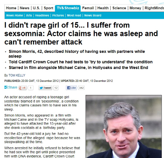 영국의 배우 사이먼 모리스가 10대 소녀를 성폭행한 혐의로 체포된 후 '섹스솜니아(sexsomnia)' 즉 잠들어 있는 동안 성적 행동을 하는 수면 장애를 이유로 들어 화제가 되고 있다.
