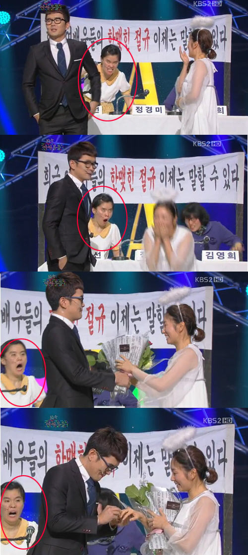 윤형빈의 닭살 공개 프러포즈에 경악한 건 방청객들뿐만이 아니었다. 처키 표정으로 윤형빈-정경미를 뒤에서 노려보며 분노하던 박지선은 그들이 닭살 고백부터 준비한 반지를 선물하는 순간까지 뒤에서 계속해 광분하며 입을 크게 벌리고 경악하는 모습을 보여 웃음을 유발했다.