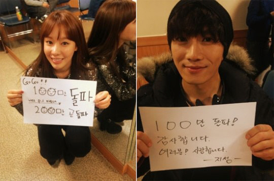 두 사람의 100만 돌파 인증샷은 최근 '나의 PS 파트너'의 공식 트위터를 통해 공개됐다. 김아중은 "100만 돌파, 200만 곧 돌파"란 글이 적힌 종이를 든 채 환하게 미소를 지어 보였다. 지성 역시 "100만 돌파! 감사합니다. 여러분! 사랑합니다"란 메시지를 전했다.