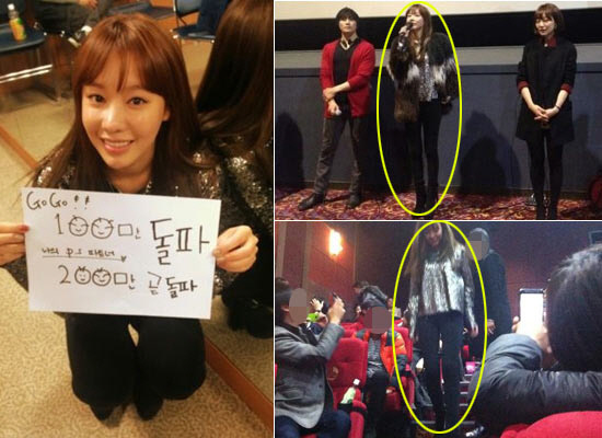 또한 영화 '나의 PS 파트너'의 공식 트위터를 통해 공개된 100만 돌파 인증샷에서도 김아중은 쭈그려 앉은 포즈를 취했음에도 허벅지 살이 펴지지 않고, 다리 사이에 공간을 보여 '극세사 다리의 위엄'을 드러내 놀라움을 자아낸다.