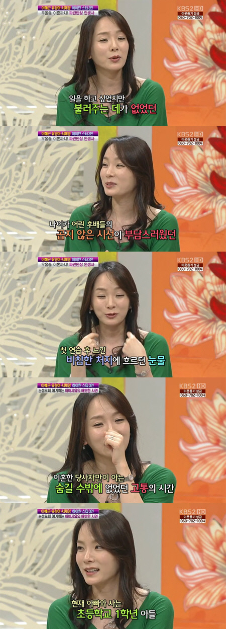 사생활 노출을 꺼려 결혼 사실도 알리지 않았던 유경아는 초등학교 1학년 아들을 떠올리며 눈시울을 붉혔다. 그는 "방송에 나오는 걸 정말 많이 망설였다. (그 이유는) 아이가 아직 이혼이라는 단어를 모른다"며 "엄마 아빠가 따로 사니까 본의 아니게 짐작은 하겠지만 그런 걸 몰라서 그 부분이 많이 조심스럽다"며 눈물을 흘려 안타까움을 자아냈다. <스포츠조선닷컴>