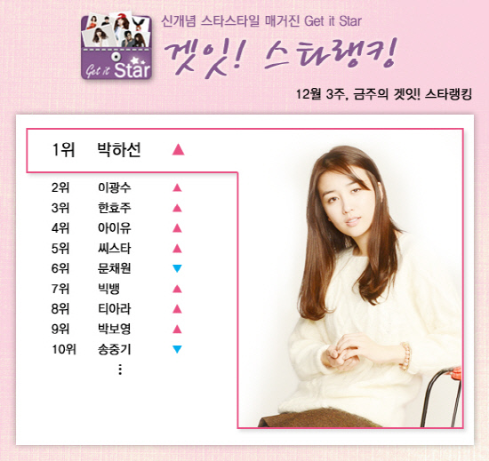 이제 아셨나요? 그럼 겟잇스타를 설치, 스타들의 포토도 보고 내가 좋아하는 스타의 순위도 높여주세요! 그럼 다음 주 순위도 기대해주세요.