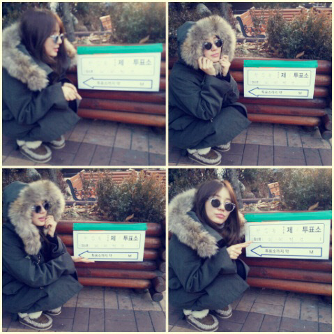 윤은혜는 19일 오전 자신의 트위터에 "촬영장 가기전에 투표 완료 !! 인증샷 찍을만한 장소가..ㅋ 불쌍하게 찰칵! 많이 추워용~ 저처럼 옷 따숩게 입구 나오셔요" 라며 사진을 공개했다. 윤은혜는 코트를 입고 투표소 안내판 앞에 앉아 인증샷을 촬영했다. 그는 투표 후 곧장 MBC 수목극 '보고싶다' 촬영장으로 향한 것으로 알려졌다.