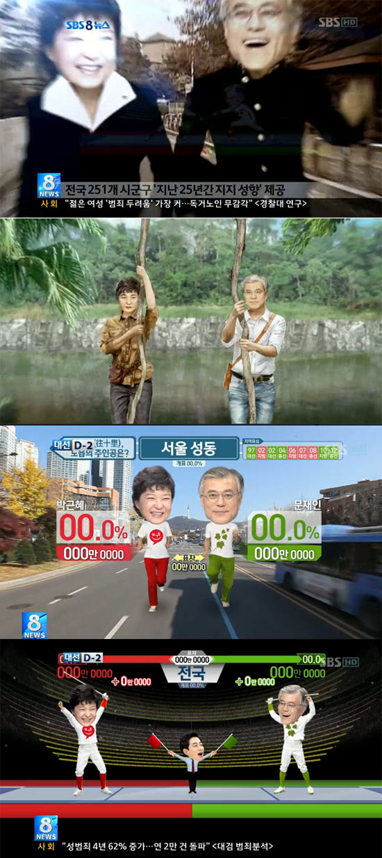 특히 SBS 대선방송은 획기적인 3D 애니메이션과 다양한 아이템을 활용해 박근혜-문재인 두 후보 간의 접전을 보도하는 기발한 방식으로 눈길을 끌고 있다.