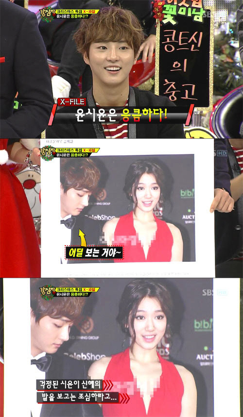 이에 당황한 윤시윤은 "이건 '나쁜 눈'이 아니다. 박신혜의 긴 드레스가 찢어져 신발에 밟혔는데 발을 보고 있는 모습이 찍힌 것이다"라며 "그 상황을 박신혜씨가 명쾌하게 해명해 줄 것"이라며 억울해했다.