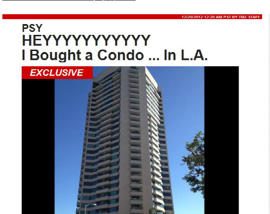 TMZ는 "싸이가 콘도 구입 비용 전액을 한국에서 송금 받았다. 이미 '강남스타일'로 790만 달러를 벌어들인 만큼 콘도 구입 자체가 놀라운 일이 아니다"고 밝혔다.