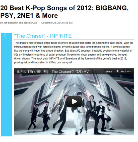 미국 빌보드는 21일(현지시각) '20 베스트 K-POP 송즈 오브 2012'를 선정했다. 인피니트는 '추격자'로 씨스타 나얼 2NE1 빅뱅 싸이 등을 제치고 1위에 올랐다. 빌보드 측은 "파워풀한 보컬, 다이나믹한 기타, 드라마틱한 바이얼린으로 이뤄진 초반부는 얼핏 방향을 못잡고 있는 것 같아 보이지만 50초 만에 폭발적인 가창력과 트럼펫이 이끄는 코러스, 80년대 신서사이저는 단숨에 음악을 변화시킨다. K-POP이 지닌 혁신을 증명하며 최고를 차지했다"고 밝혔다.