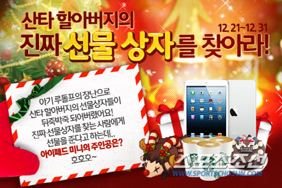 산타 할아버지의 '진짜 선물 상자' 찾기 이벤트에서는 아이패드 미니(32GB), 케이크 교환권, 커피 교환권과 타이니팜 희귀 아이템 '크리스마스 큰뿔양' 등 다양한 선물을 증정한다. 당첨 여부는 이벤트 응모 직후 바로 확인이 가능하며, 내년 1월 8일 컴투스 홈페이지에 당첨자 명단이 공개될 예정이다.