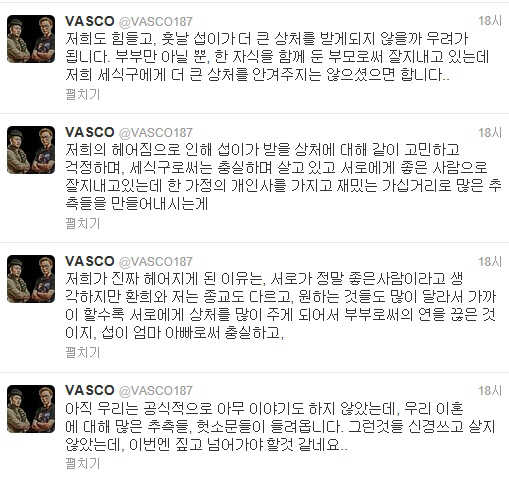 바스코는 23일 자신의 트위터에 "아직 우리는 공식적으로 아무 이야기도 하지 않았는데 우리 이혼에 대해 많은 추측들, 헛소문이 들려옵니다. 그런 것들 신경쓰고 살지 않았는데 이번엔 짚고 넘어가야 할 것 같네요. 저희가 진짜 헤어지게 된 이유는 서로가 정말 좋은 사람이라고 생각하지만 종교도 다르고 원하는 것들도 많이 달라서 가까이 할수록 서로에게 상처를 주게 돼 부부의 연을 끊은 것"이라고 밝혔다. 이어 "섭이 엄마 아빠로 충실하고 저희의 헤어짐으로 섭이가 받을 상처에 대해 같이 고민하고 걱정하며 세 식구로서 충실하며 살고 있다. 서로에게 좋은 사람으로 잘 지내고 있는데 한 가정의 개인사를 가지고 재밌는 가십거리로 많은 추측들을 만들어 내는게 우리도 힘들고 훗날 섭이가 더 큰 상처를 받게 되지 않을까 우려된다. 부부만 아닐 뿐 한 자식을 함께 둔 부모로서 잘 지내고 있는데 우리 세 식구에게 더 큰 상처를 안겨주진 않으셨으면 합니다"라고 당부했다.