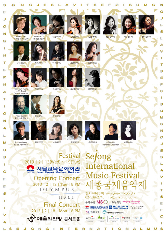 2월 13일부터 19일까지 7일간 서울 양재동 서울교육문화회관 호텔과 올림푸스홀, 예술의전당 등에서 열리는 세종국제음악제는 오프닝콘서트와 페스티벌, 파이널콘서트 등으로 진행된다.