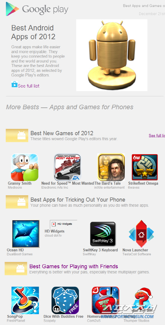 '베스트 안드로이드 앱 2012'에서 친구들과 즐기는 게임 부문 베스트 게임에는 '홈런배틀2' 이외에도 'SongPop', 'Dice With Buddies Free', 'wePlay' 등이 선정됐다.