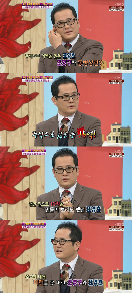 이에 MC 조영구는 "사업으로만 망하면 괜찮다. 표영호는 나처럼 주식으로 많은 손실을 봤다. 누구보다 그 마음을 잘 안다"고 말했다.