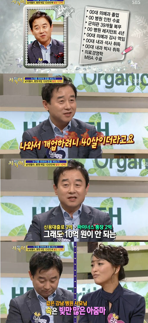 이어 "불혹 40에 가진 돈은 하나도 없고, 혼수용 집 한 채만 달랑 있더라. 결국 지금 시세로 20억 정도 되는 삼성동 집을 팔았다"라며 "그래도 병원을 개업하기에는 자금이 부족해 신용 대출과 마이너스 통장에 정부 저리 대출까지 받아 병원을 개업했다. 병원 개업 후 10억 원 빚을 떠안았다"고 고백해 놀라움을 안겼다.