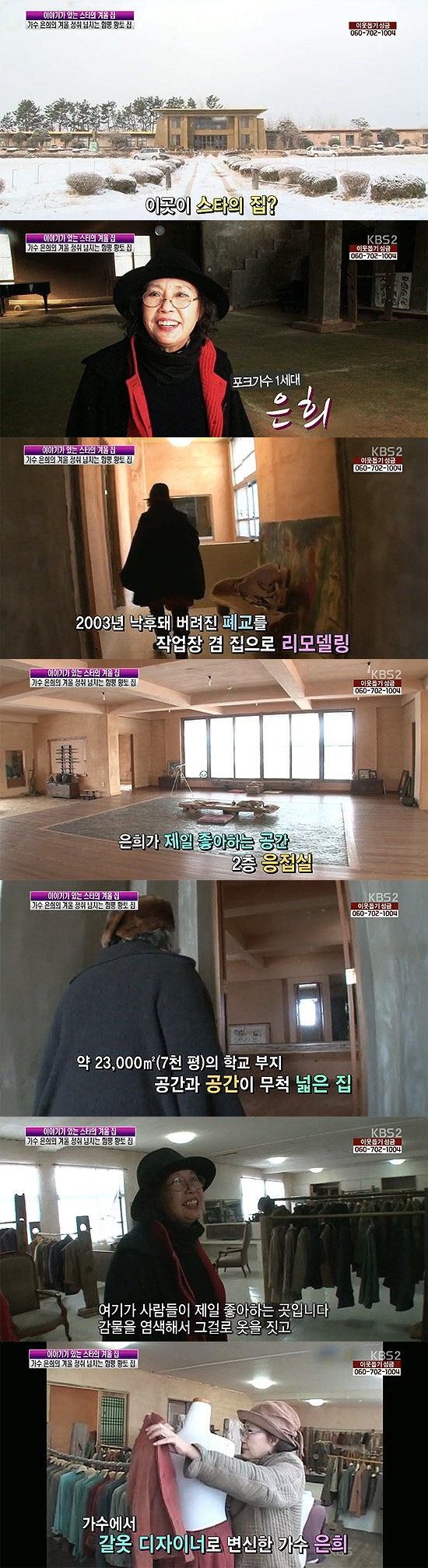 창가에 앉은 은희는 "눈 내리는 날 여기 앉아서 차 마신다. 일출과 일몰 풍경이 최고다"라며 "내가 누군지도 돌아보게 되고 탁 트인 느낌이라서 좋다"고 말하며 대저택에서 즐기는 낭만과 운치가 가득한 생활을 소개했다.