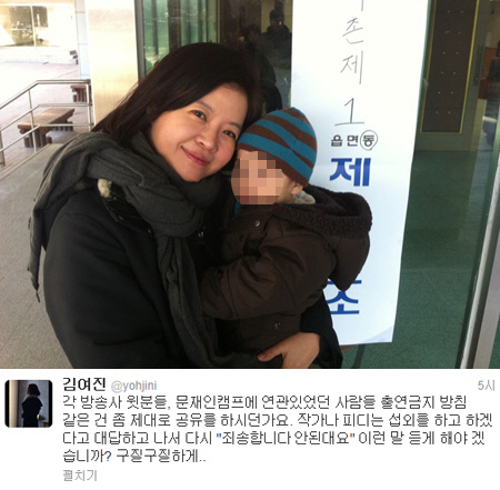 또한 김여진은 자신의 글을 본 한 네티즌이 "(방송 섭외 금지)블랙리스트가 존재하고 있는 것이냐"고 묻자 "이젠 블랙도 아니다"며 단호하게 답했다. 또 다른 네티즌이 "마음이 너무 무겁다"라고 멘션을 달자 김여진은 "뭐 예상은 했던 일이다. 좀 짜증나는 정도…"라고 답하기도 했다.<스포츠조선닷컴>