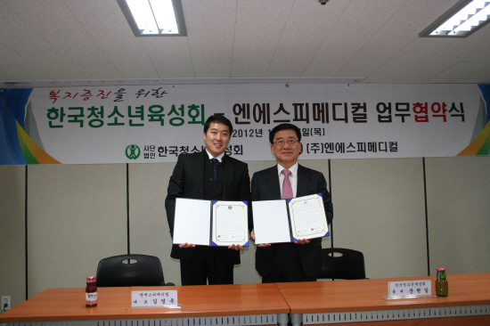 ◇NSP메디컬 김영욱 대표와 문현일 한국청소년육성회장이 지난해 12월27일 업무협약을 맺고 기념촬영을 하고 있다.