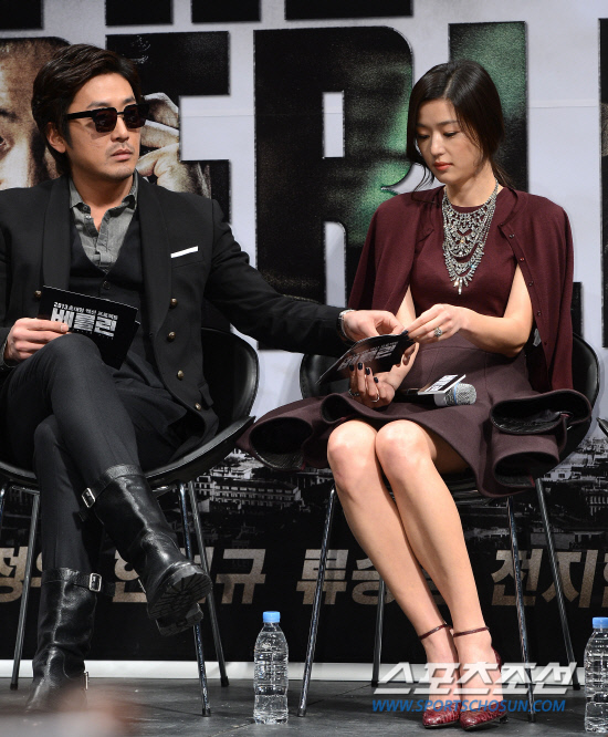 7일 서울 압구정CGV에선 '베를린'의 제작보고회가 열렸다. 이 자리에서 전지현은 "'도둑들'에서 호흡을 맞춘 김수현이 좋냐, '베를린'의 하정우가 좋냐?"는 잘문에 1초의 망설임도 없이 "하정우씨요"라고 답했다.