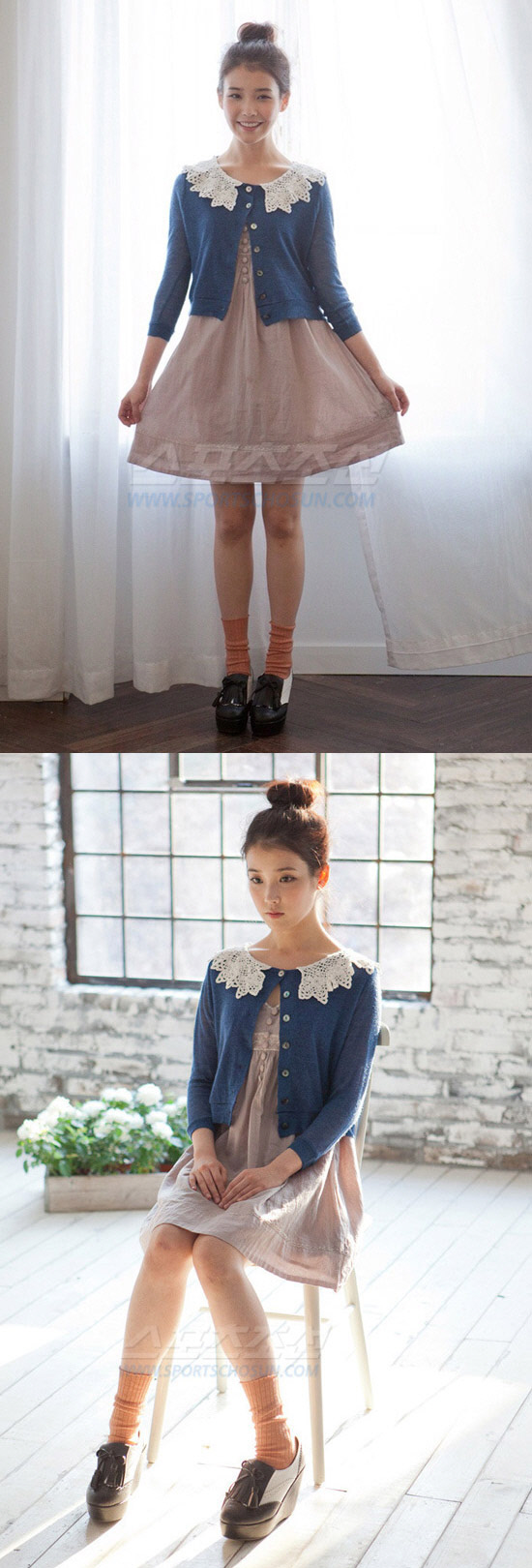 사진 속 아이유는 머리를 위로 올리고, 레이스 달린 청색 카디건에 살색 원피스를 입고 청초한 분위기 물씬 풍기고 있다. 맨다리에 주황색 긴 양말을 신고 검은색 신발로 매치한 복고풍 패션에 특유의 싱그러운 미소를 짓고 있어 눈길을 끌고 있다.