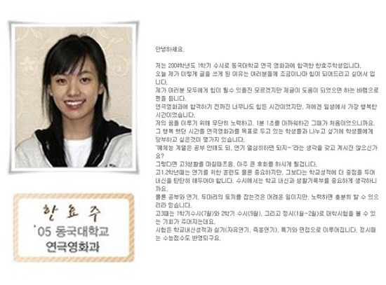 사진 속 한효주는 앳된 얼굴에 투명한 피부와 잇몸미소로 풋풋한 매력을 발산하며 청순함을 뽐내고 있다. 지금과 별다를바 없는 자연미모와 똑부러지는 탁월한 글 솜씨가 팬들의 시선을 고정시켰다.