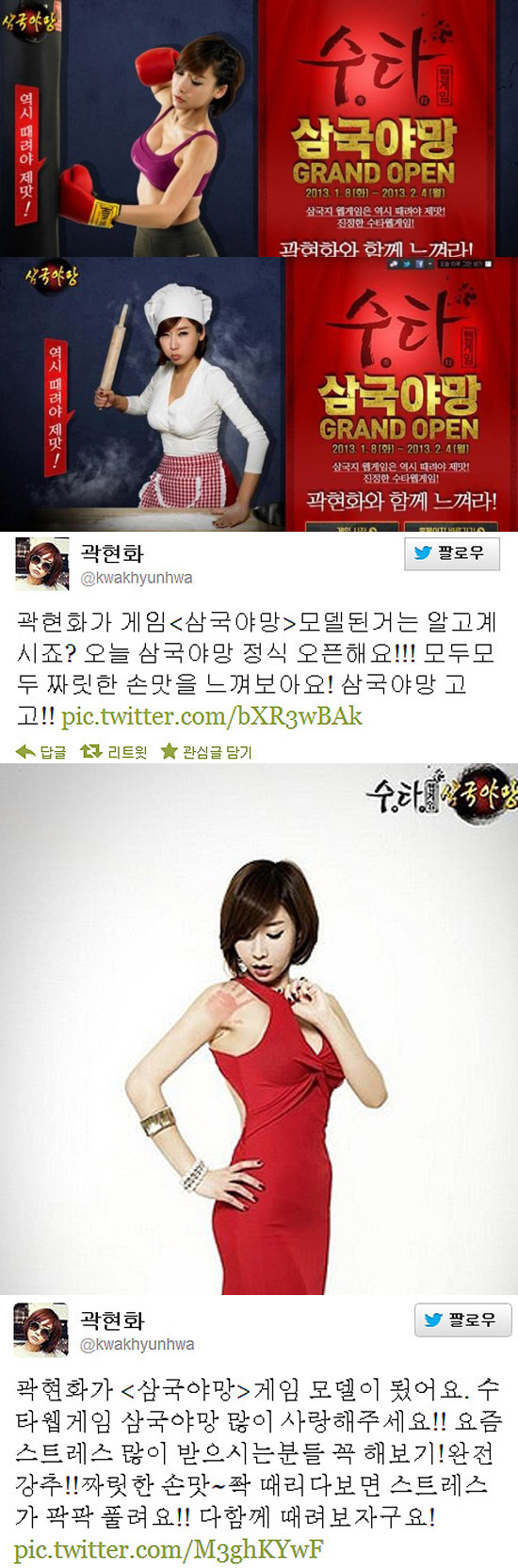 지난 7일 곽현화는 자신의 트위터에 "곽현화가 게임<삼국야망>모델 된 거는 알고 계시죠? 오늘 삼국야망 정식 오픈해요!!! 모두모두 짜릿한 손맛을 느껴보세요! 삼국야망 고고!!"라는 글과 함께 한 장의 사진을 게재했다.