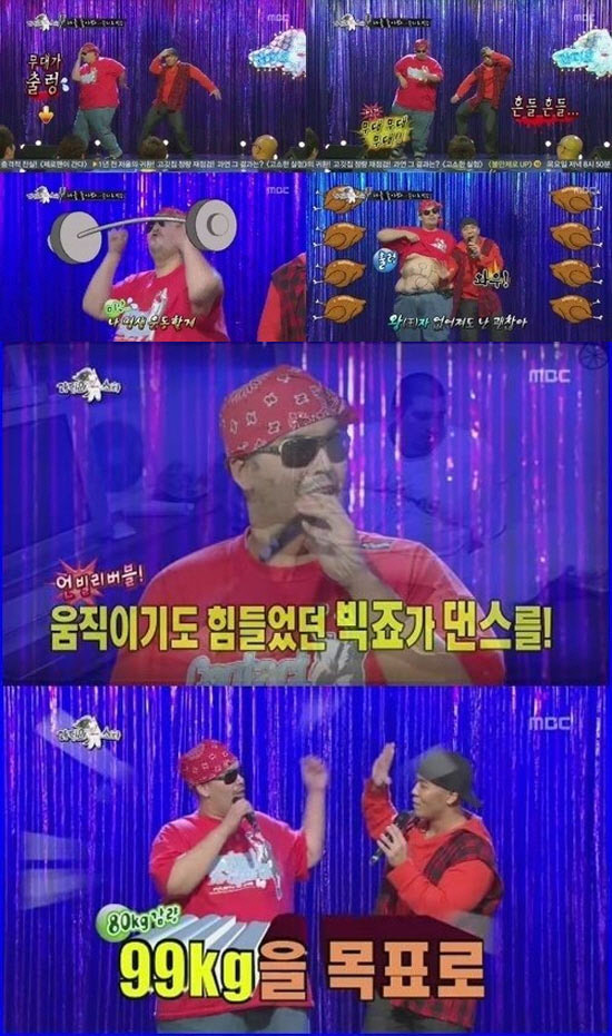 최근 한 프로그램에서 숀리와 함께 다이어트에 도전해 100kg를 감량한 빅죠는 이날 숀리와 함께 노래에 맞춰 가볍게 댄스를 소화해 출연진들을 놀라게 했다. 그러나 빅죠의 무게에 무대가 출렁이는 장면이 포착돼 웃음을 자아내기도 했다.