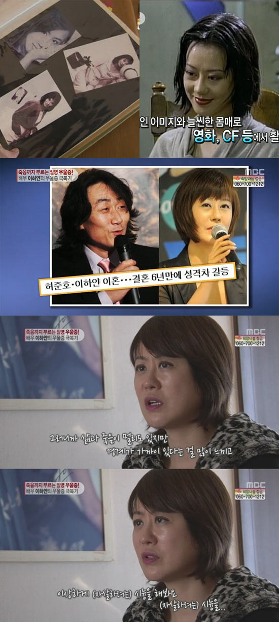 이하얀은 "낮에는 선글라스나 모자를 써도 햇빛 때문에 어지러웠다. 머리에 원형탈모와 몸에 아토피가 생겼다. 집에 들어오면 꼼짝하기도 싫었다. 시체처럼 지냈다"며 우울증에 휩싸였던 지난날을 회상했다. 이어 그녀는 "우울증이 극에 달했을 때는 6개월 동안 수면제를 사서 투명 비닐봉투에 모아 놓고 계속 쳐다봤다. 지금 생각하면 소름 끼친다. 삶과 죽음이 멀리 있기도 하지만 경계가 가까이 있다는 걸 많이 느꼈다. 이상하게 자살하려는 시늉을 많이 해봤다"며 자살시도 경험을 고백해 충격을 안겼다.
