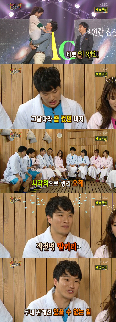 김기리는 10일 방송된 KBS 2TV '해피투게더3'에 출연해 "얼마 전 '개그콘서트-불편한 진실' 코너에서 김지민을 안는 장면과 관련한 루머에 대해 해명하고 싶다"며 입을 열었다.