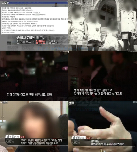 40대 여성이 길거리에서 노모에게 절규했다. 노모는 끝내 여자를 외면했다. 14일 방송된 MBC '이야기 속 이야기-사사현'에서는 최근 인터넷을 달군 20년간 친오빠에게 성폭행을 당해온 여동생의 사연을 전파했다. 김정희 씨(가명)는 유복한 가정의 3남 1녀 중 막내딸. 그녀 주장에 따르면 중학교 2학년 때부터 친오빠의 성폭행에 시달렸고, 결국 대학교 때 친오빠 아이까지 임신한 뒤 엄마의 손에 이끌려 강제로 낙태를 당했다. 하지만 그녀가 결혼 후에도 친오빠는 조카들이 있는 집까지 찾아와 여동생을 탐했다. 여동생은 "저항하려 했지만 옆에 자고 있는 아이들이 깰까봐 끝까지 반항할 수 없었다"고 말했다.