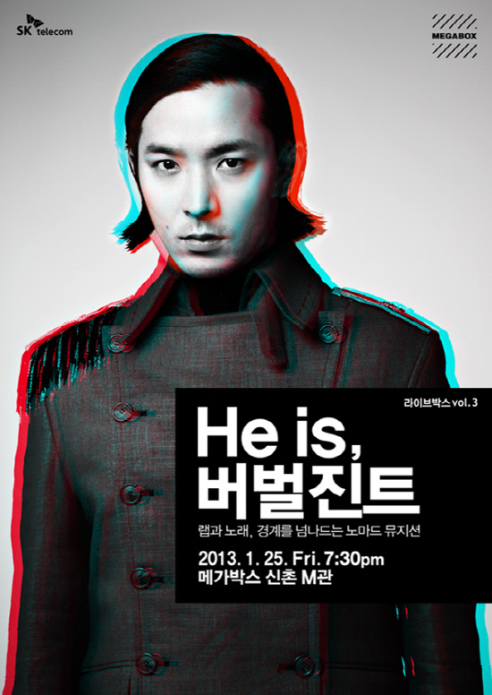 올해 라이브박스 시작을 여는 주인공은 가수 버벌진트다. 레게밴드 '윈디시티', 아코디언 연주가 '심성락'에 이은 세번째 공연인 'He is, 버벌진트' 콘서트는 오는 25일 오후 7시 30분 메가박스 신촌점 M관에서 열린다.