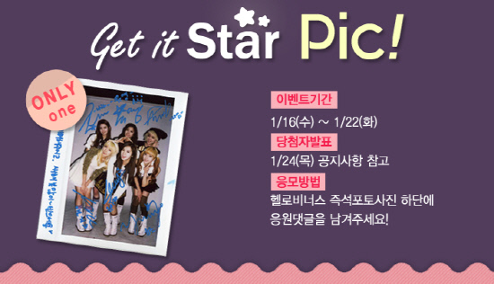 스타 스타일 매거진 어플리케이션 '겟잇스타'의 '겟잇! 스타Pic' 이벤트 그 7번째 시간! 이번에는 다시 돌아온 6인의 요정 '헬로비너스'의 사인이 담긴 즉석 포토를 드립니다. 최신곡 '오늘 뭐해'로 컴백한 헬로비너스의 발랄한 모습을 겟잇스타에서 만나보세요! 팬클럽에 등록하면 최신 이슈 및 더 많은 포토를 만나보실 수 있어요~