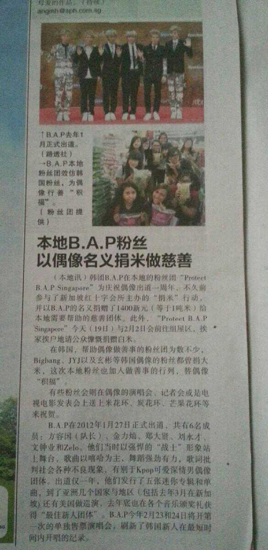 지난 19일, 싱가포르의 다수의 언론 매체들은 B.A.P(비에이피)의 싱가포르 팬클럽인 'Protect B.A.P Singapore'가 B.A.P(비에이피)의 데뷔 1주년을 기념해 B.A.P(비에이피) 이름으로 싱가포르 적십자사에 1톤의 쌀을 기부했다고 전했다.