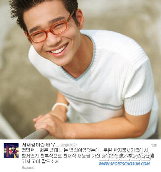 서재경은 21일 자신의 트위터에 "정명현... 형은 병태 나는 병식이였었는데.. 우린 한지붕 세가족에서 형제였지 천부적으로 천재적 재능을 가진 배우였는데.. 부디 좋은 곳에 가서 고이 잠드소서"라는 글을 게재했다.