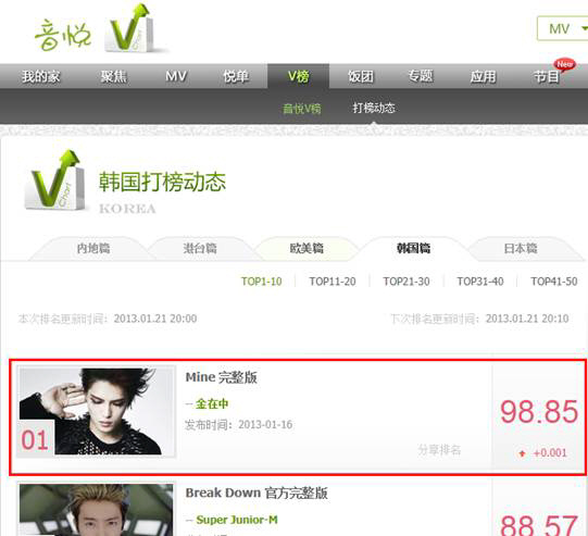 인웨타이 V차트는 조회수에 팬들이 직접 매긴 점수를 반영해 집계되어 중국 내 실제 인기를 가장 잘 반영하는 차트로 알려져 있다. '마인' 뮤직비디오를 공개한지 5일만에 2위와 큰 격차를 벌리며 1위를 차지한 김재중의 중국 내 인기를 실감케했다.