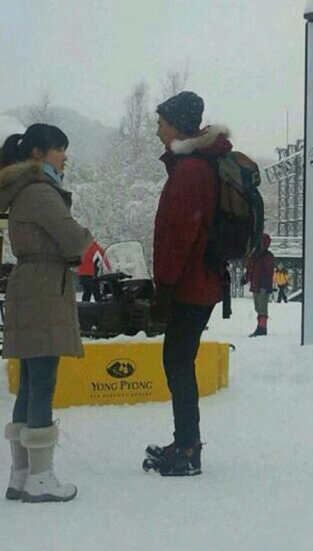 강원도 평창군에 있는 용평리조트에서 SBS 드라마 '그 겨울, 바람이 분다'를 촬영 중인 두 사람은 추위에 완전무장을 한 모습. 두툼한 베이지색 패딩 점퍼에 털 부츠까지 신은 송혜교는 추위를 피하려고 꽁꽁 싸맨 모습이지만 아름다운 옆모습은 고스란히 드러났다. 바로 옆에선 조인성은 붉은색 야상 점퍼에 백 팩, 털모자를 쓰고 훤칠한 키를 자랑하며 감출 수 없는 모델 포스를 풍겼다.