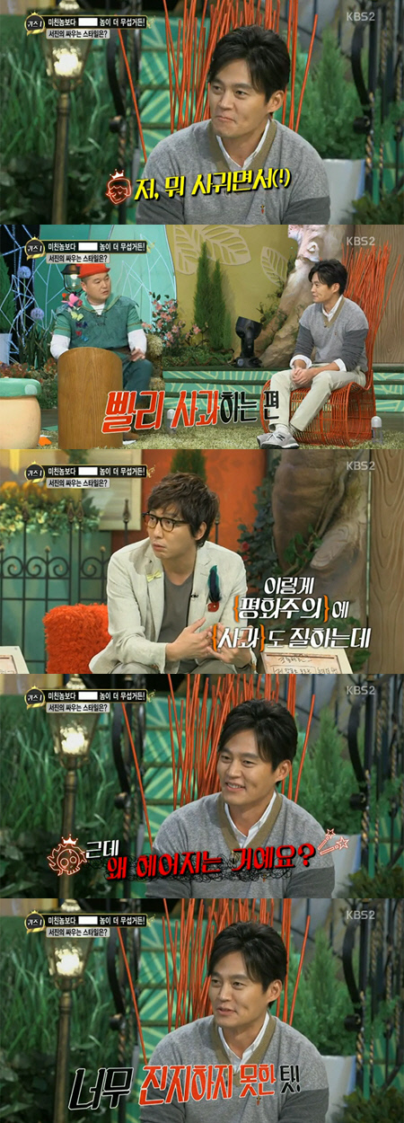 이날 MC 탁재훈은 "사귀면서 싸울 때 어떤 스타일이냐"고 넌지시 물었고, 이서진은 "이기고 싶은 생각이 없다. 진지한 걸 안 좋아해서 빨리 사과하는 편이다. 갈등 상황을 빨리 끝내고 싶어한다"고 답했다.