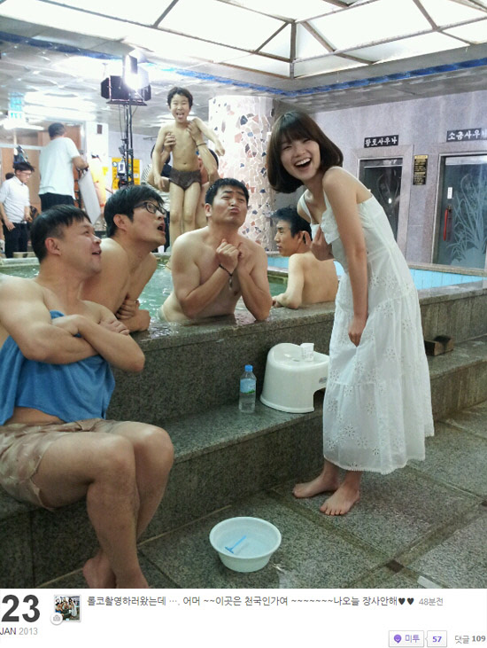 공개된 사진에서 그녀는 흰색 민소매 원피스를 입은 채 남탕에서 벌거벗은(?) 수많은 남자들에게 둘러싸여 있다.