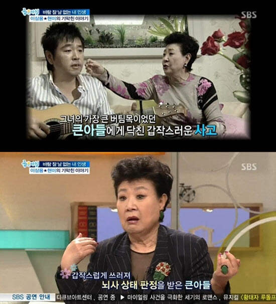 24일 방송된 SBS '좋은 아침'에 출연한 현미는 바람 잘 날 없는 인생사에 대해 이야기 하던 중 얼마 전 심장마비로 갑자기 쓰러져 뇌사판정을 받은 큰아들에 대해 말문을 열었다.