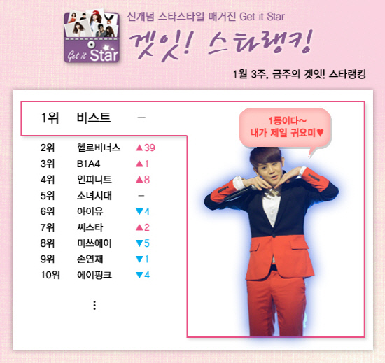 '대세' 비스트가 2013년 1월 3주차 겟잇스타랭킹에서도 정상에 등극, 3주 연속 1위를 차지했습니다. 솔로 데뷔, 영화 & 드라마 출현 등 활발한 개인 활동을 통해 쉼 없이 달리는 비스트의 독주 체제가 어디까지 이어질 것인지, 대항마는 누가 될지 관심이 쏟아지고 있네요.