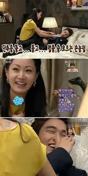 최근 인터넷 커뮤니티에는 '유승호 옷 벗겨주다 NG 난 신은경'이라는 제목으로 MBC '해피타임'이 소개한 촬영 NG 장면이 게재됐다. 공개된 영상은 신은경이 술에 취해 침대에 기분좋게 쓰러진 아들 유승호의 옷을 벗겨주는 신. 신은경은 유승호의 넥타이를 푼 뒤 자켓을 바로 벗기기 않고 와이셔츠 단추를 풀기 시작했다. 단추가 하나 두개 계속 풀리자 누워있던 유승호가 당황하며 결국 NG가 났다. 이에 신은경도 당황해 "진짜 여기까지만 풀려고 했어. 답답하니까. 두개만"이라고 해명했고, 유승호는 연신 수줍은 미소를 지으면서 "옷을 벗기는데 단추는 왜 풀러요"라고 반문해 제작진까지 웃음이 터지고 말았다.